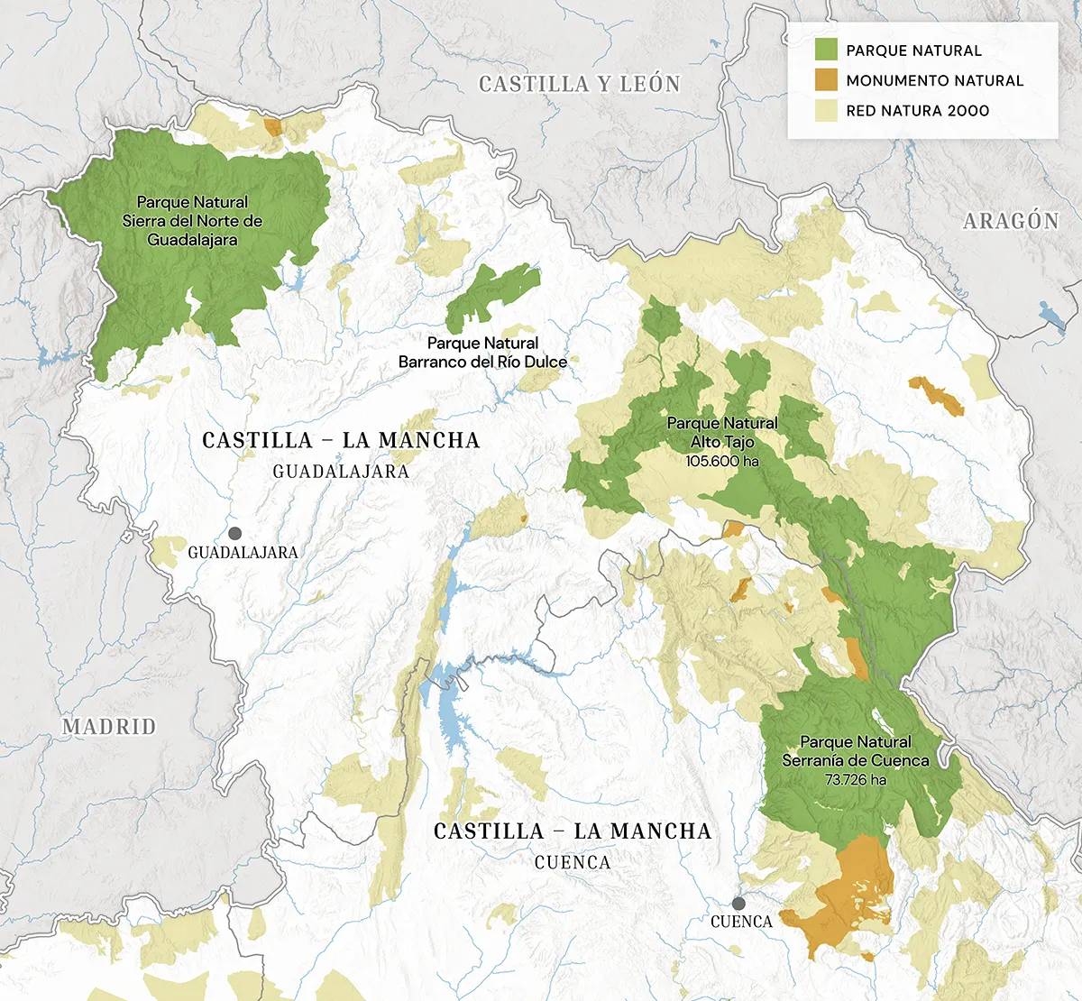 Estos parques albergan los tramos altos de ríos como el Tajo y el Júcar, espectaculares cañones fluviales, lagunas de montaña y una gran variedad de ambientes de bosque y pastizal, además de una riquísima fauna silvestre y un patrimonio cultural único.